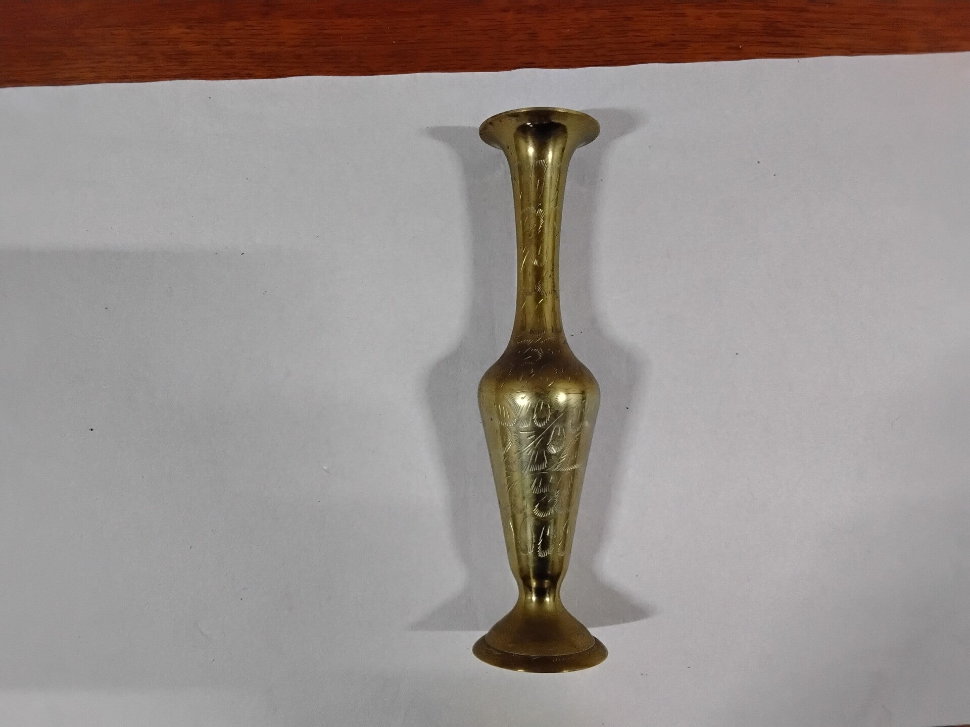 Vase en cuivre jaune incrusté de nombreux petits motifs. Il peut aussi servir de bougeoir. Hauteur : 28cm