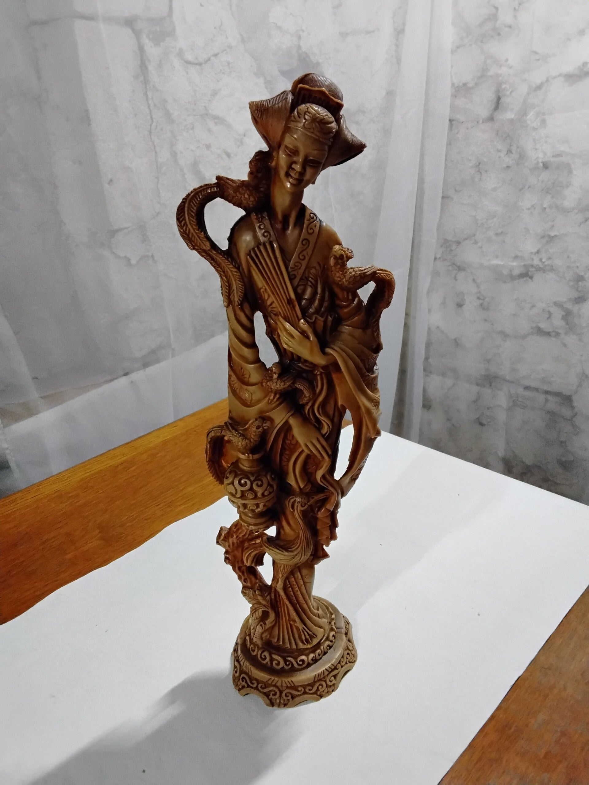 Magnifique statuette chinoise en résine avec ses nombreux détails finement sculptés. Hauteur : 46cm