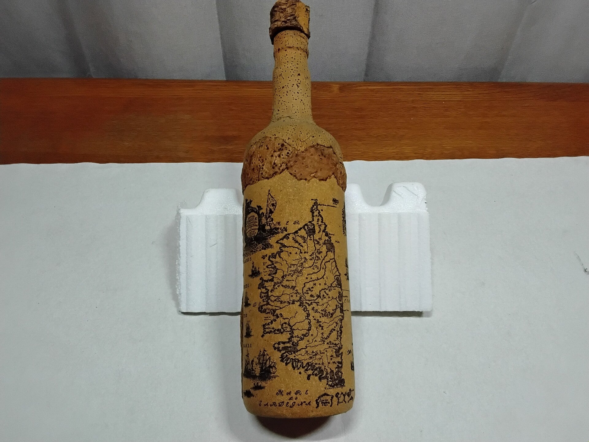 Belle bouteille recouverte de liège représentant l'île de Corse. Hauteur : 34cm