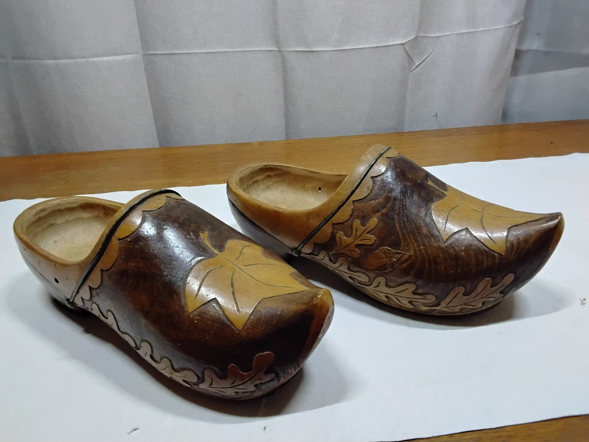 Magnifique paire de sabots bois sculptés de feuilles de chêne et glands. Pointure 41-42.