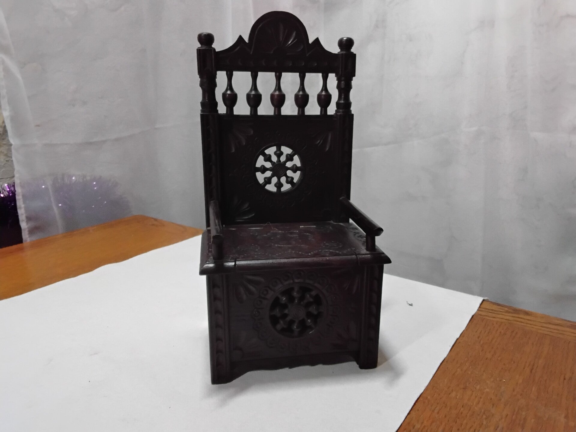 Coffret bois en forme de trône royal avec de jolis motifs sculptés. Sa hauteur est de 27cm.