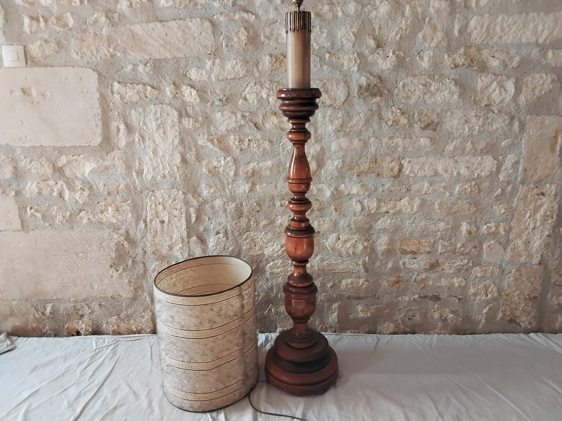 Magnifique lampe à colonne en bois avec une moulure imitation bougie. Son abat-jour est recouvert d'une matière cotonneuse ce qui le rend très original. La hauteur de cette lampe est de 180cm. Cet article est à retirer à l'adresse du vendeur. Il n'y a pas d'expédition.