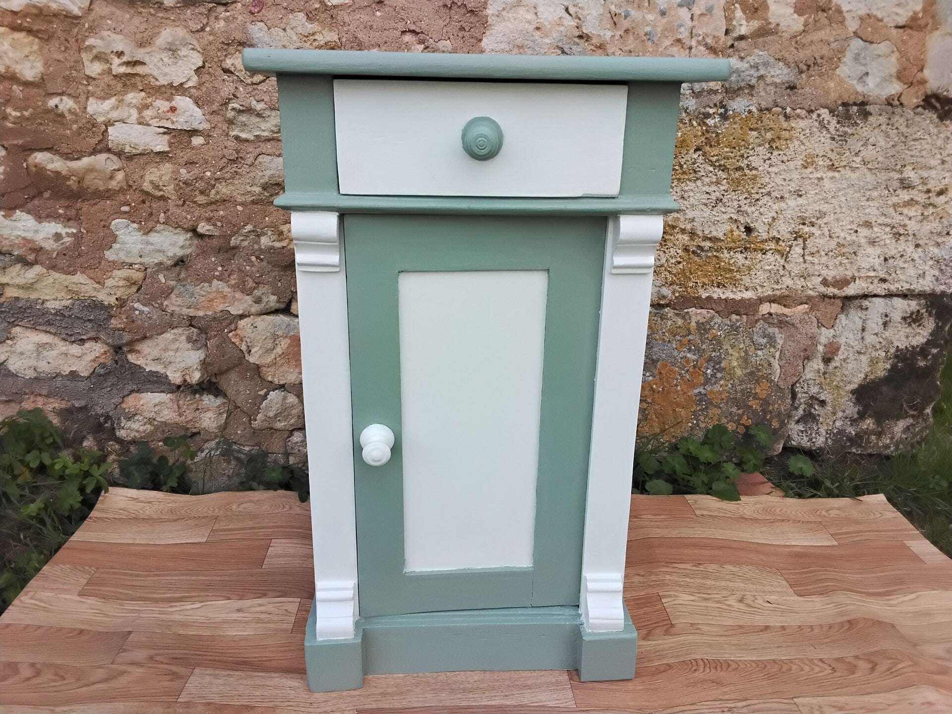 Table de chevet bois restaurée bicolore blanc et vert sauge. Tiroir et placard avec étagère intérieure assortie. Dimensions : Largeur 38cm / Profondeur 36cm / Hauteur 70cm. Cet article est à retirer à l'adresse du vendeur. Il n'y a pas d'expédition.